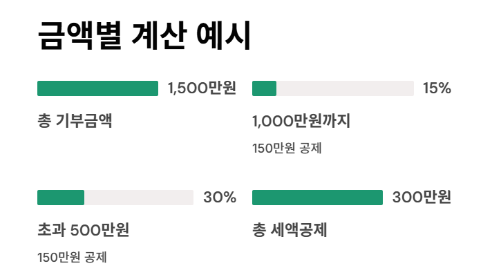 예를 들어 1500만원을 기부했다고 할 때, 1000만원까지는 15퍼센트 공제, 초과 500만원은 30퍼센트 공제가 적용됩니다. 이렇게 계산하면 총 300만원의 세액공제가 가능하다는 결론이 나와요. 직접 계산해보면 한도 내에서 어떤 혜택을 받을 수 있는지 직관적으로 이해가 더 잘 됩니다.