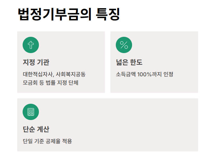 법정기부금은 법률로 지정된 기관에 기부하는 금액으로 분류돼요. 대한적십자사나 사회복지공동모금회처럼 공익성 높은 단체들이 여기에 포함되죠. 이 유형은 소득금액 100퍼센트까지 인정되는 넓은 한도를 가지고 있어 부담 없이 기부 혜택을 누릴 수 있어요. 공제율도 단일 기준으로 적용되기 때문에 계산이 비교적 단순한 편입니다.