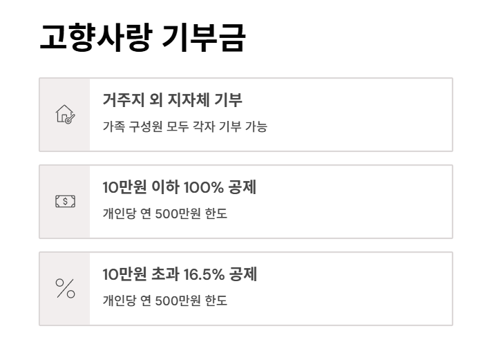 고향사랑 기부금은 최근 관심이 높아진 유형으로, 거주지 외 지자체에 기부할 수 있다는 특징이 있어요. 10만원 이하 전액 공제라는 장점과 함께, 10만원 초과분은 16.5퍼센트 공제가 적용됩니다. 가족 구성원 모두가 각자 기부할 수 있다는 점도 유용한 부분이에요. 아래 표처럼 정리하면 이해가 더 쉬워요.