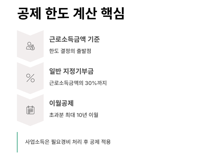 기부금 세액공제는 근로소득금액을 기준으로 한도가 결정됩니다. 일반 지정기부금은 근로소득금액의 30퍼센트까지 인정되기 때문에 연봉 대비 어느 정도까지 공제가 가능한지 사전에 계산해 두면 좋습니다. 한도를 넘어가는 경우에는 최대 10년까지 이월공제가 되니, 초과했다고 해서 손해라고 볼 수만은 없어요. 다만 소득 유형이 사업소득일 때는 필요경비 처리 이후 공제가 적용되기 때문에 구조가 다릅니다.