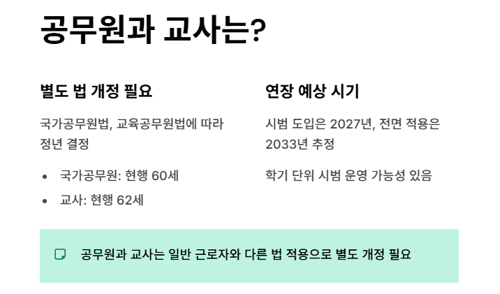 따라서 공무원과 교사는 별도 법 개정 없이는 적용 대상이 아니며, 실제 정년 연장은 2033년 이후로 보는 것이 현실적입니다.