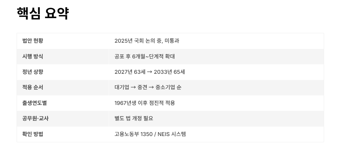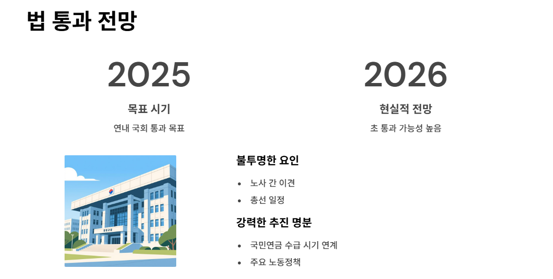 정부와 여당은 이재명 정부의 공약에 따라 2025년 내 법안 통과를 목표로 하고 있으며, 기업 부담을 줄이기 위한 임금피크제와 재고용 방안도 병행 논의 중입니다.
