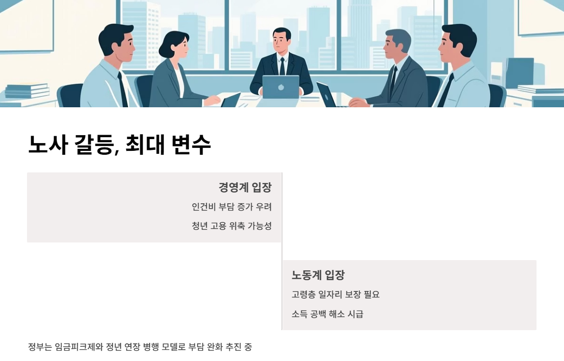 경영계는 인건비 부담을, 노동계는 고령층 일자리 보장을 강조하며 팽팽히 맞서고 있습니다.