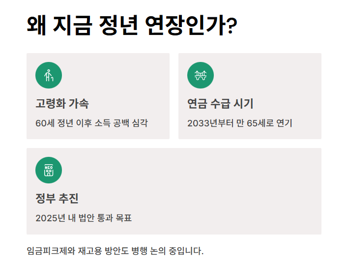 특히 국민연금 수급 개시 연령이 2033년부터 만 65세로 늦춰지면서, 정년 역시 이에 맞춰 상향 조정 필요성이 커졌죠.
