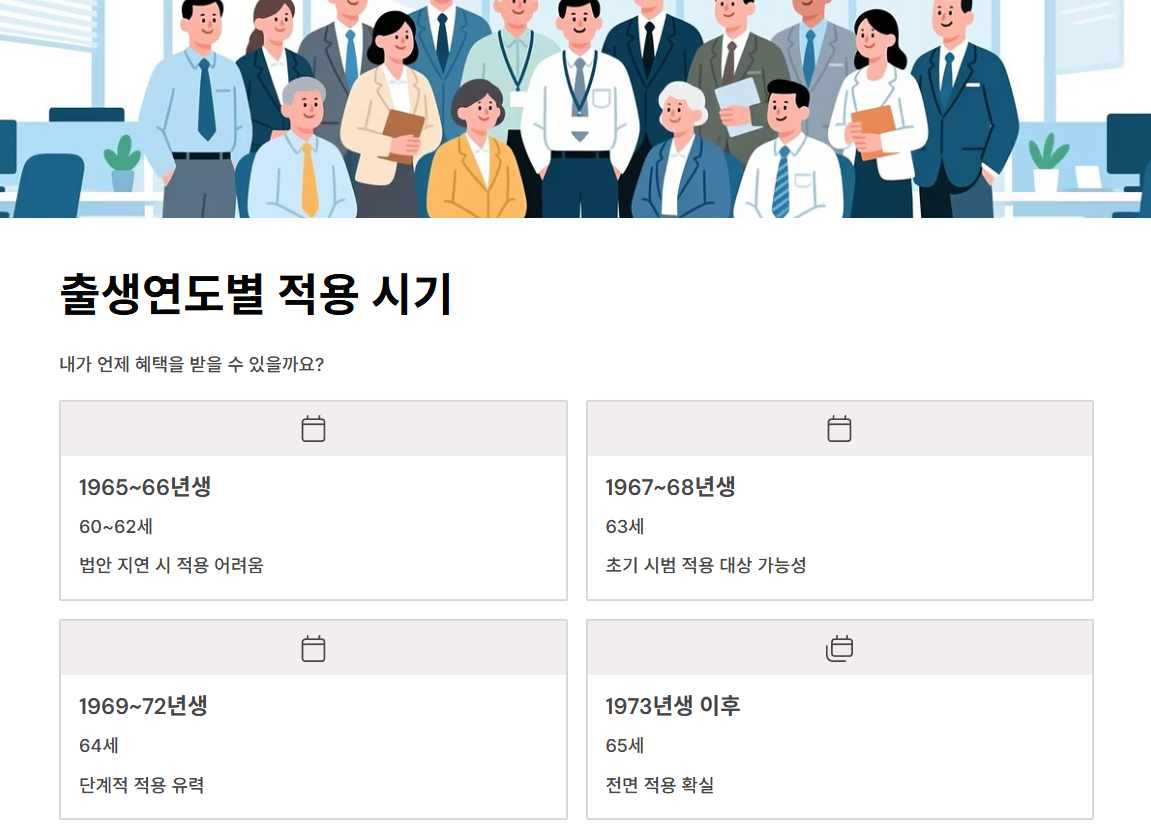 | 1965~66년생 | 2025~26년 | 60~62세 | 법안 지연 시 적용 어려움 |
