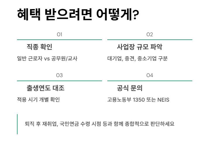 각자의 직종, 사업장 규모, 출생연도에 따른 적용 여부를 반드시 개별 확인해야 합니다.