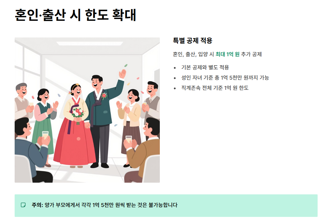 단, 이 추가 공제는 '직계존속 전체' 기준 1억 원 한도이므로, 양가 부모에게서 각각 1억 5천만 원씩 받는 것은 불가능합니다.