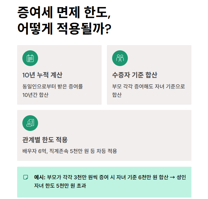 예를 들어, 부모가 자녀에게 각각 3천만 원씩 증여했다면 자녀 기준으로는 6천만 원이 합산되어 면제 한도(성인 자녀 기준 5천만 원)를 초과합니다.