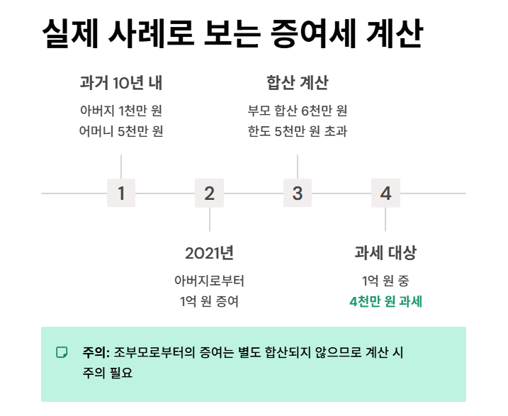 부모 합산 6천만 원은 기준 한도(5천만 원)를 초과했기 때문에, 1억 원 중 4천만 원이 과세 대상이 됩니다. 조부모로부터의 증여는 별도 합산되지 않으므로 계산 시 주의가 필요합니다.