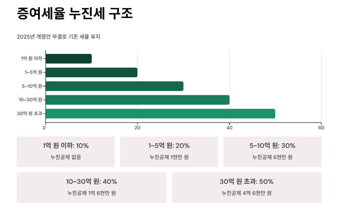 증여세는 금액대별로 누진세가 적용되며, 2025년 개정안이 부결됨에 따라 기존 세율이 유지됩니다.