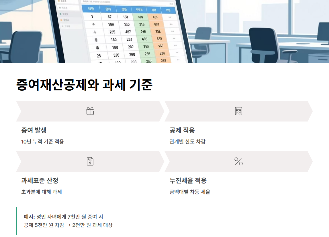 증여세는 10년 누적 기준으로 증여재산공제가 적용되며, 초과분에 대해 과세가 이루어집니다. 예를 들어, 성인 자녀에게 7천만 원을 증여했을 경우 공제한도 5천만 원을 초과한 2천만 원에 대해 과세됩니다.